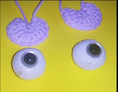 Hacemos dos bolitas y, ponemos los ojos de seguridad que queramos. Una vez secas ponemos un poco de brillo esmalte para uñas. Los ponemos justo en la vuelta donde hemos empezado con los aumentos. Estos ojos están pegados con cola especial goma eva.