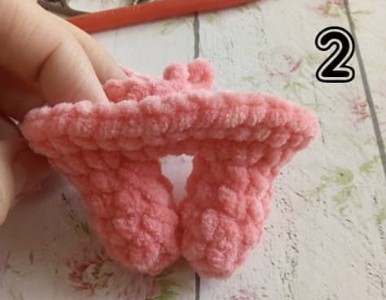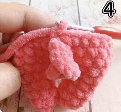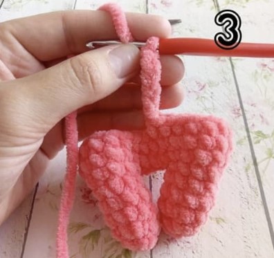 V 8: 29 pb, 6 cad (para la cola) – aum en la 2ª cad desde la gancho de croché, 4 aum en los siguientes 4 pb, 1 pb en el cuerpo (30) (Imagen 3, 4)
