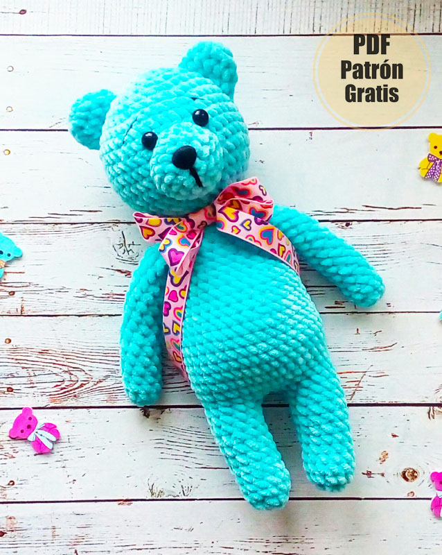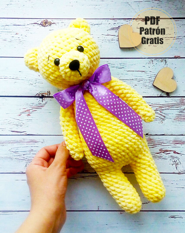 La cinta de corazón de colores atada alrededor del cuello añade vivacidad al juguete amigurumi de osito de peluche. También hace que el osito de peluche parezca un regalo muy especial. Este juguete les gustará mucho especialmente a los hijos de tus vecinos o amigos. El osito de peluche también debe estar muy bien relleno.