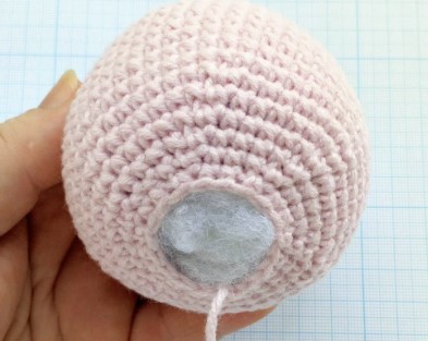 Coser el hocico a la cabeza entre los ojos. Colocar un poco de relleno dentro del hocico antes de terminar.